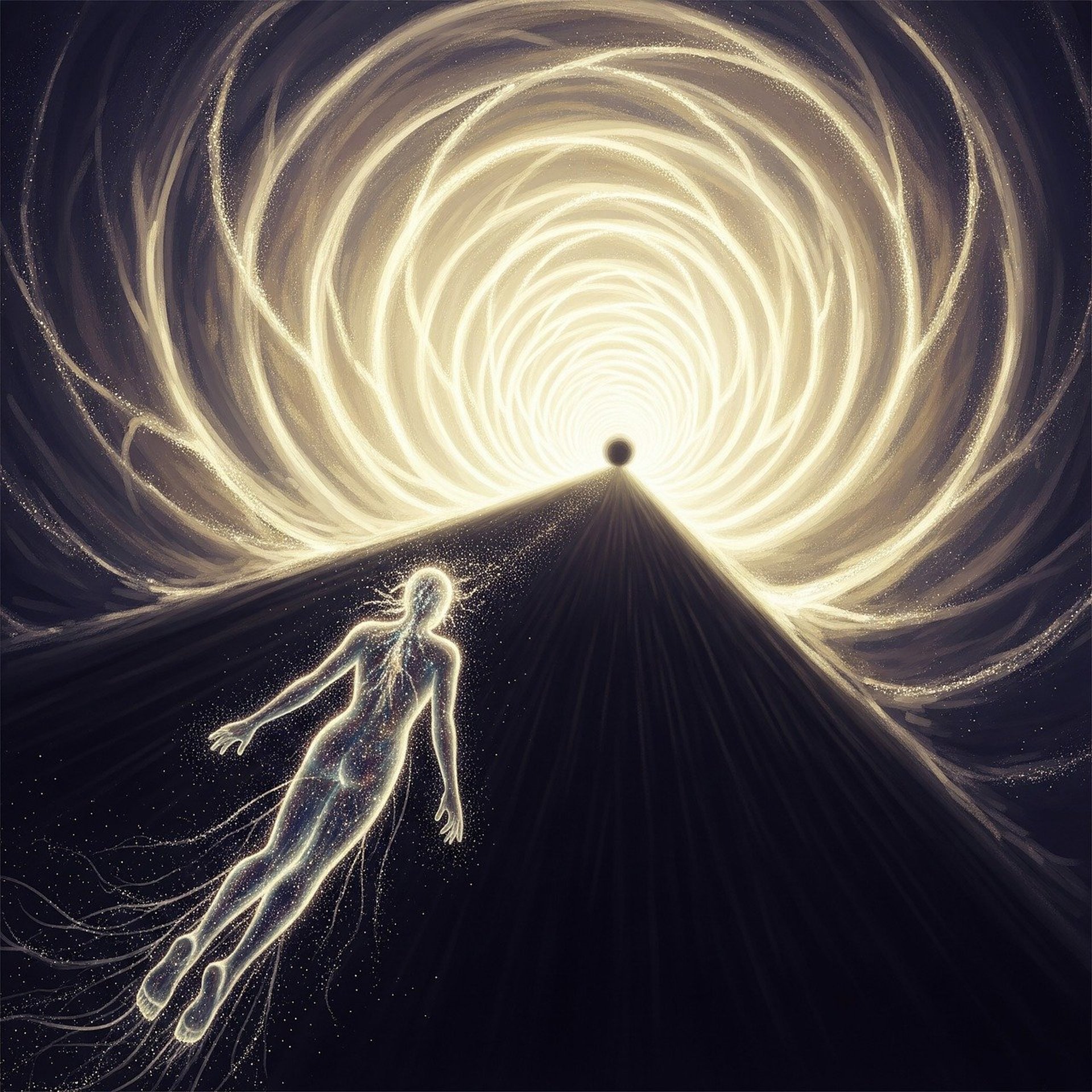 The tunnel and the light represent the transition corridor — the consistent rule of passage. The light is not only visual brightness but ontological luminosity: the unveiling of a greater field of being. It is continuity, invitation, and expansion of awareness.
